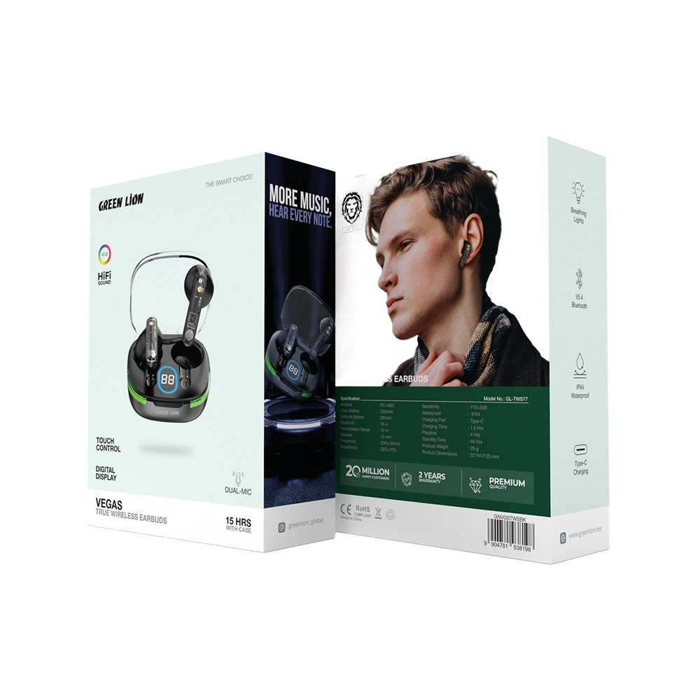 ایرباد Green Lion Vegas True Wireless ترکیبی از طراحی مدرن، کیفیت صدای بالا و عملکرد هوشمند است. این مدل با رنگ مشکی مات و نورهای تنفسی (breathing lights)، جلوهای خاص و حرفهای دارد. نمایشگر دیجیتال روی کیس شارژ، وضعیت باتری را بهصورت دقیق نمایش میدهد و کنترل لمسی، استفاده از آن را ساده و سریع کرده است.